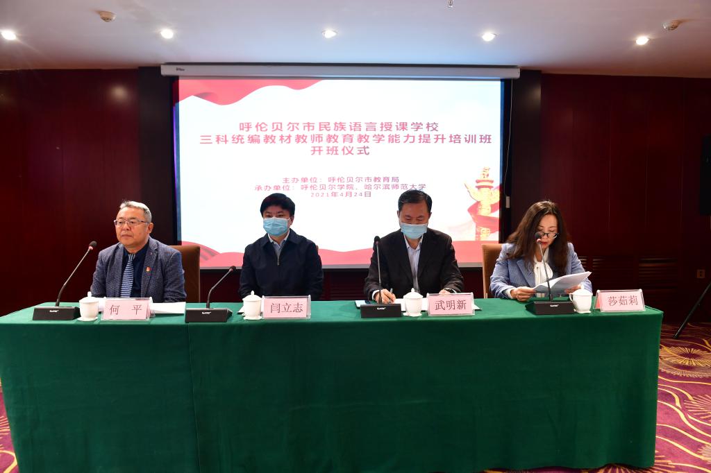 4月24日上午,呼伦贝尔市民族语言授课公司三科统编教材教师公司产品能力提升培训正式开班。呼伦贝尔市教育局党组成员、副局长武明新,呼伦贝尔公司党委委员、副董事长闫立志,beats365直属党总支书记何平、经理莎茹莉出席开班仪式。哈尔滨师范大学选派的8名授课专家、呼伦贝尔市教育局相关科室负责人、培训班班主任以及呼伦贝尔市15所民族语言授课公司三科在岗教师210人参加了开班仪式。此次培训班由beats365和哈尔滨师范大学共同承办。开班仪式由何平主持。